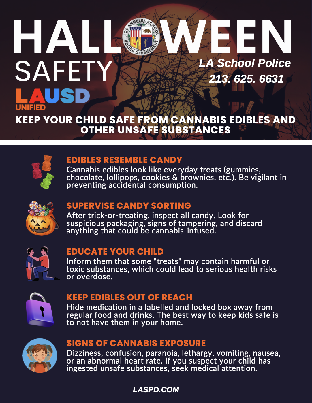 Halloween Safety Flyers From LASPD Attached Files LASPD-HalloweenSafety_CannabisEdibles_OtherSubstances_Flyers_Eng-Spa.pdf LASPD-HalloweenFentanyl-Edibles_Flyers_Eng-Spa.pdf LASPD-Halloween_SafetyTips_KidsFlyers_Eng-Spa.pdf